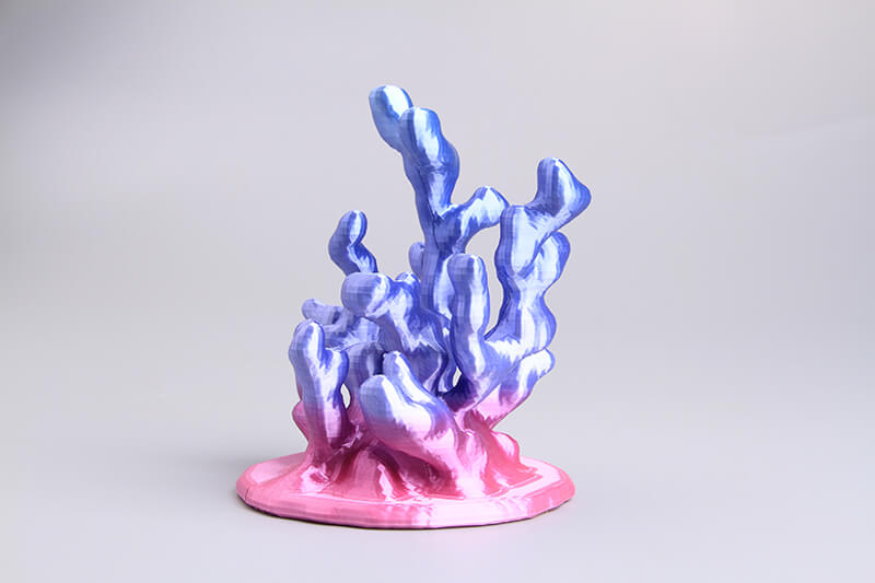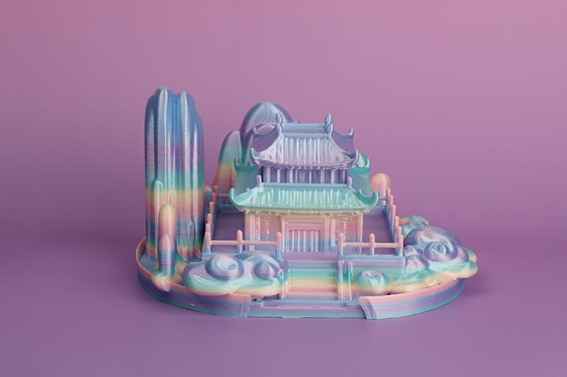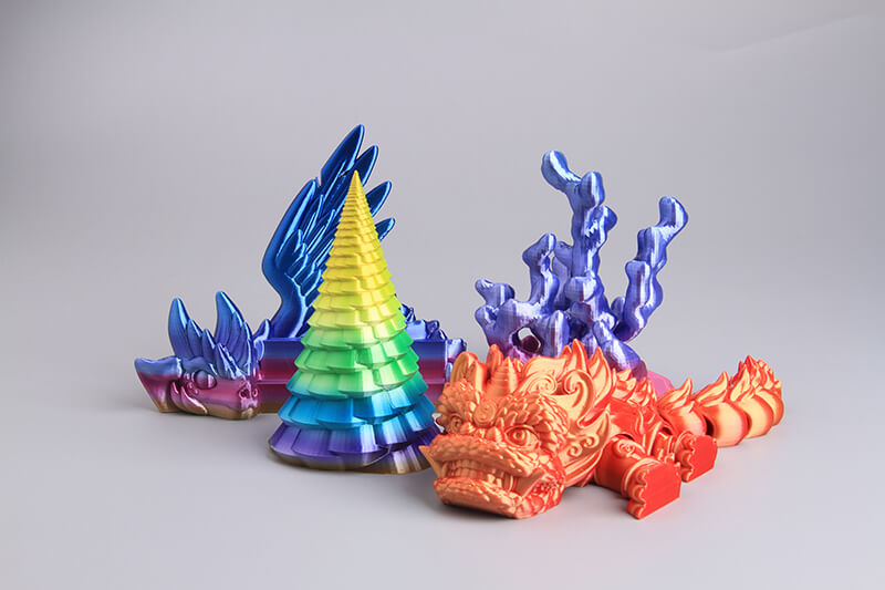 PLA-Silk Rainbow ofron një shkëlqim mëndafshi dhe teksturë të rafinuar, me spektrin e ngjyrave që i japin modeleve bukuri të gjallë dhe rrezatuese, si shiritat e mëndafshit në ylber. Sipërfaqja mbetet e lëmuar, pa shtresim, dhe mbështet heqjen e lehtë të materialit mbështetës.